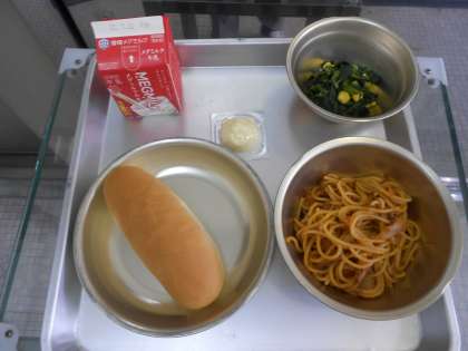 小型コッペパン 牛乳 スパゲティのミートソース煮 ほうれん草のソティ チーズ