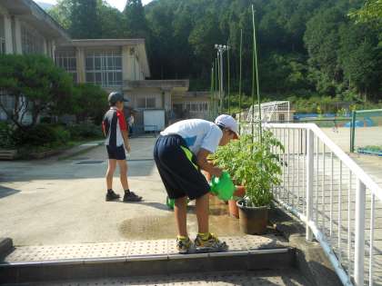 トマト学習の2回目が迫ってきています。学校で育てているトマトと岐阜で同じように鉢植えで育てているトマトを比べる日があと少しです。朝の水やり、晴天の日は、欠かせません。