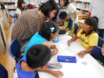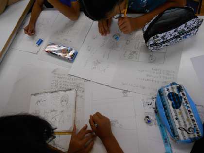 4こまマンガを作りました。夏のひと時の様子を起承転結を意識して児童それぞれが考えて作りました。作文となると手の進みの遅い児童も、あっという間にストーリーを考えて作成します。最後に、自分の作品の説明をしていました。