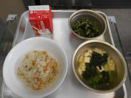 こぎつねちらし 牛乳 だいこん葉とじゃこのいためもの かきたま汁