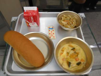 コッペパン 牛乳 ツナごぼうサンド パンプキンチャウダー