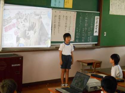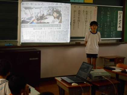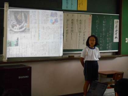 新聞の切り抜きからわかったこと、考えたことを発表し、感想交流しました。段ボールを利用して遊園地を作った記事,動物園の暑さ対策の記事,叡山電車のハート型つり革の記事でした。わかりやすく身近な内容なので,低学年も交流がしやすかったです。