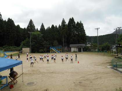雨が上がり、運動場での練習です。立つ場所、間隔を確かめながら練習しています。