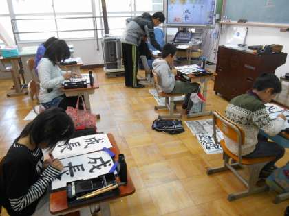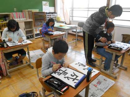 書写の時間です。自分の書いた字を字形や接筆を確かめています。自己批正することで、文字に対する意識が高まります。