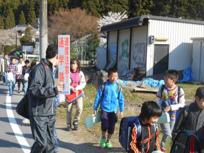 集団登校です。「速度注意!」の呼びかけカードを掲示しながらの登校です。府道になると、ガードレールがあるものの自動車のスピードは制限速度より早いように思われます。児童は、習ってない漢字でも「速度注意」と読みます。関心を持つことで、なんとなく身の回りの漢字を読むようになります。