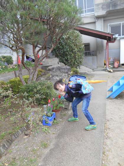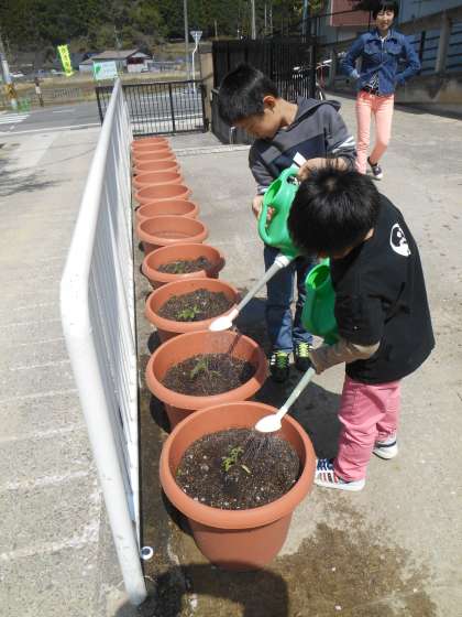 土曜日に苗を植えたことが、「楽しかった」そうで、朝会うなり、「楽しかった」と言っていました。また、自分から水やりを進めていました。自分が植えたもの以外にも水をやらないといけないと考え実行していました。