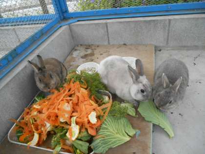 地域の方のご協力により、うさぎの餌を確保しています。キャベツの葉っぱのあまりや小さい人参、人参の皮(調理時にでる)などです。ウサギは喜んで食べています。