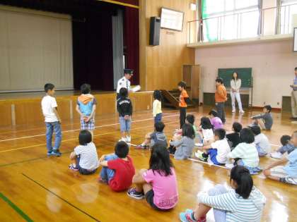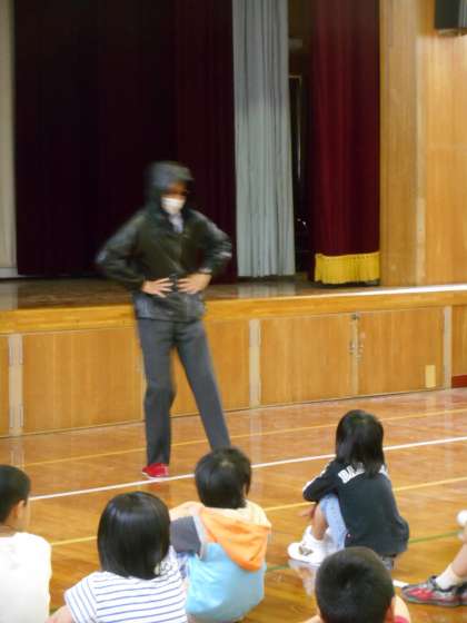不審者が侵入したという想定で、教職員は、不審者対応の訓練となりました。児童には、防犯ブザーの使用や「いかのおすし」についての確認をしました。「助けてー」と大きな声を出す訓練もしました。あってはならないことですが、そのような事件に巻き込まれないことやもしもの対応の仕方について教えていただきました。