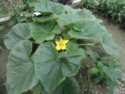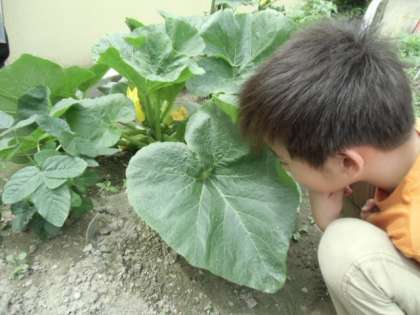 2年生で育てているズッキーニがぐんぐん育って、葉が顔より大きくなりました。花が咲き、実もでき始めています。隣の枝豆のところまで進出してきそうです。