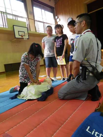 はじめは、ダミー人形の胸に手を当てる位置がずれてしまったり、30回続けると「はあ〜」と疲れた様子を見せたりしていましたが、何度か繰り返すうちにリズム良く正確にできるようになってきました。