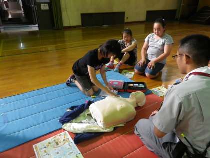 子どもたちは、胸骨圧迫法とAEDの使い方を何度も練習しました。