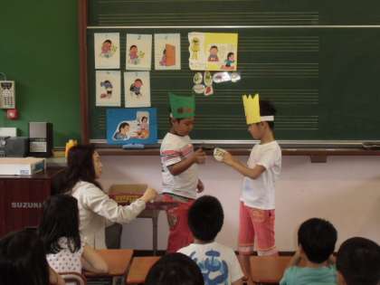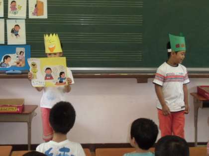 2年生は、赤・黄・緑の3つの栄養について、栄養戦隊のヒーローになって発表しました。