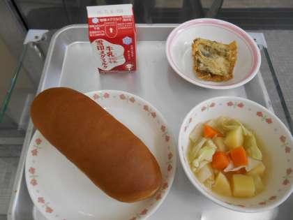 ミルクコッペパン 牛乳 さわらの香草あげ 野菜のスープ煮