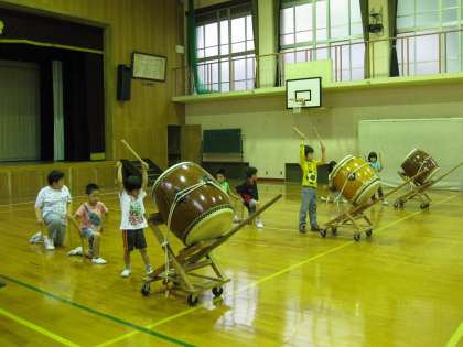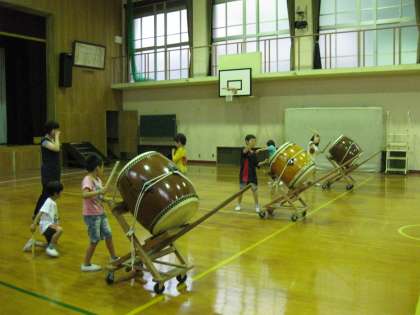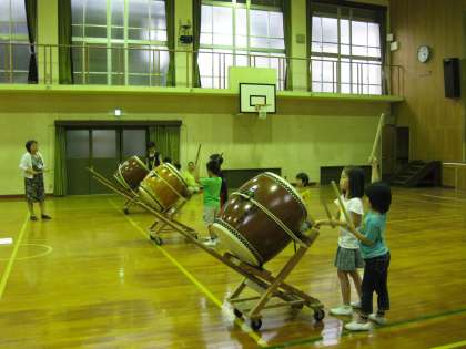 太鼓練習。しっかりきれいに手を上げて打つことやかまえること意識して児童が練習しています。待つ姿勢もきれいな姿です。どんな姿で打てばよいかがわかり自分の目標として練習しているからこそ上達が速いです。