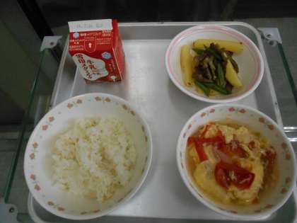 玄米ごはん 牛乳 牛肉とじゃがいものいためもの トマトと卵のスープ