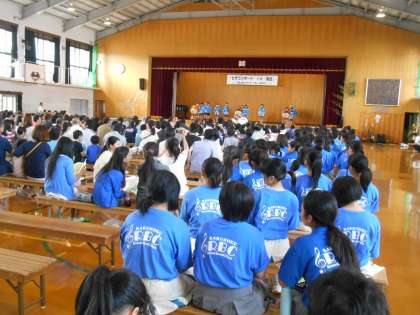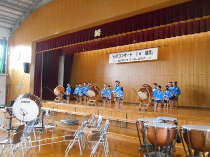 静原伝承太鼓が、1年生を入れての初めての舞台を踏みました。入学から3か月ほどで、練習期間については、もっと短い中で堂々ときれいな姿勢で演奏ができました。太鼓を順番に代わりますが、1年生は意欲的で、前の方に積極的に出てきます。どんどん上達していきます。