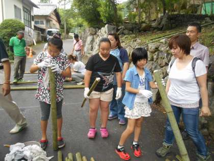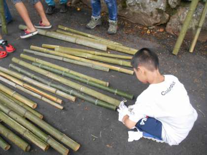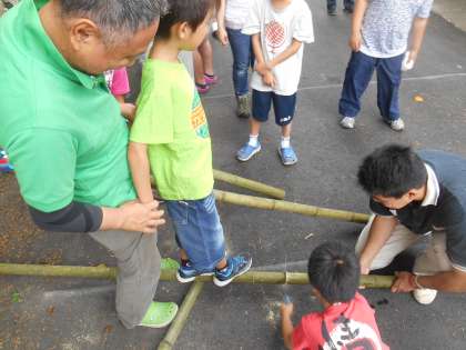 田の虫おくりに向けての松明つくりをしました。鋸を使うのが楽しいようで、たくさんできました。
