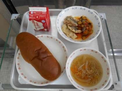 黒糖コッペパン 牛乳 あじのからあげ ラタトゥユ スープ