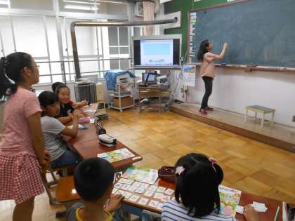 英語学習でなく外国語活動です。英語を覚えることよりも外国語といういつもとは違うコミュニケーションの仕方で少し緊張したり意欲的になったりしてコミュニケーションをとろうとすることを重きにしての時間です。結果として、英語での簡単な会話の仕方が身に付きます。「リピートアフターミー」で繰り返し覚えましょうとトレーニングするのでなくきれいなカードを使うことやチャンツをすることで楽しくコミュニケーションを自らとろうとします。英語に耳慣れ、聞き取ろうとして、答えようとして主体的に時間が進み、英語でのやり取りの仕方がトレーニングでなく結果として自然と身に付きます。