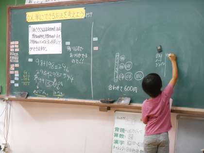 算数の学習です。問題の解き方の説明を黒板に書きみんなに見てもらいながら説明をしていました。自分の考えを書いて説明すること、人の説明を見ながら聞くこと、考え方の交流、集団思考が成立していました。