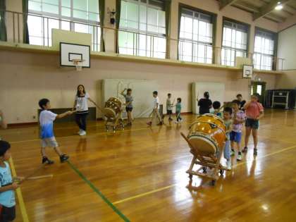 7月14日に向けて、練習をしています。太鼓を引いて進みながら太鼓を演奏しました。