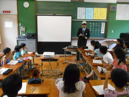 教員の静原タイムです。児童の発表や生活の仕方、目標の設定への刺激となる発表です。陸上競技の審判には、たくさんの人で勝敗や記録測定を正確に行っていること、機器の活用をしている話と、世界中には不思議なものびっくりするものすごいものがありそれを知ることやそこから考えることがいっぱいあるという話でした。
