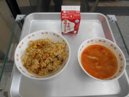 カレーピラフ 牛乳 トマトスープ(台風献立)