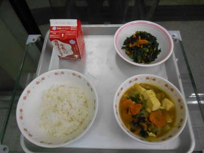 麦ごはん 牛乳 とうふのカレー煮 ほうれん草のいためナムル