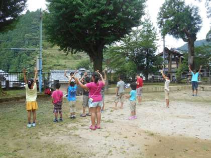 ラジオ体操、後半です。もうじき、授業が始まるということで、児童は、早起きをして参加しています。部活動の交流会のある日は、参加が少なくなります。