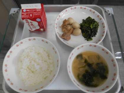 今日から授業が始まり、給食も開始となりました。今日の給食は、ごはん、牛乳、鶏肉のさっぱり煮、ほうれん草のごま煮、とうがんのみそ汁です。