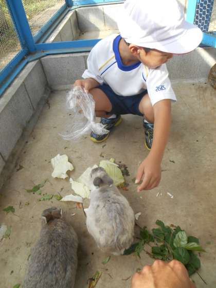 うさぎのエサを持ってきて餌やりをしています。自分の家で捨てられる、人参のへたなどを持ってきています。家で声をかけて用意をしてもらって持ってきています。うさぎの「ありがとう」「またもってきてね」という声が児童には、聞こえたようです。