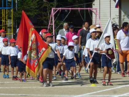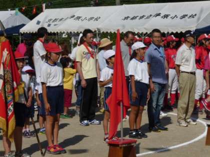 素晴らしい秋晴れのもと静原小学校・学区民合同大運動会が14日に行われました。子どもたちと学区民の方々が一緒に入場行進し、盛大に開会式が行われました。