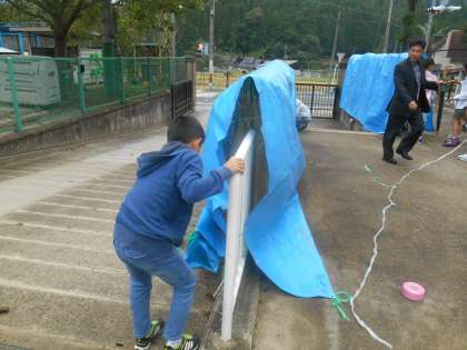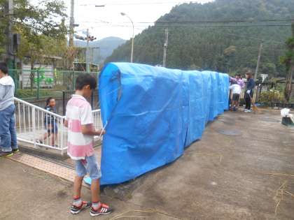雨が降ってきては、乾燥はできません。雨対策に、ブルーシートをかけて飛ばないようにくくりました。