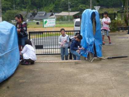 「静のゆめ」の稲刈りの後、稲を干したのですが,雲行きがあやしくなり雨の予報が出ました。早く稲を守らなければなりません。みんなで手分けしてブルーシートをかぶせてひもで結びつけて固定しました。そのあと,雨が降り,しかもその日の夜は大雨でした。次の日,学校に来たら,ブルーシートは飛ばされることはなく,稲は無事でした。