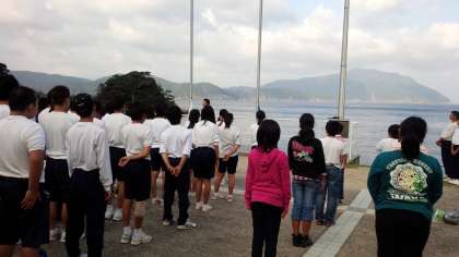 岐阜県加納中学校と朝の集いです。旗揚げのあと感想を述べました。