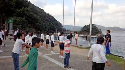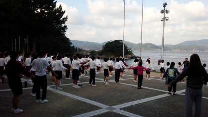 学校紹介のあとは全員でラジオ体操です。夏休みのがんばりをここでも発揮しました。