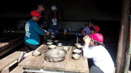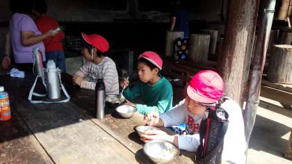 昼食は豚丼と具だくさんのみそ汁です。みんなで協力して作ったご飯はとてもおいしかったです。