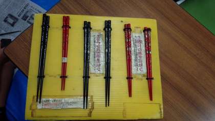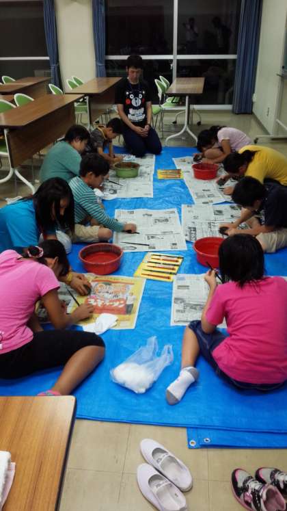 4日目夜の活動は若狭ぬりばし作りです。デコボコの箸の表面を水ペーパーでこすっていくと、アワビの飾りやきれいな色が出てきます。お家へ持ち帰りますので、お楽しみに。