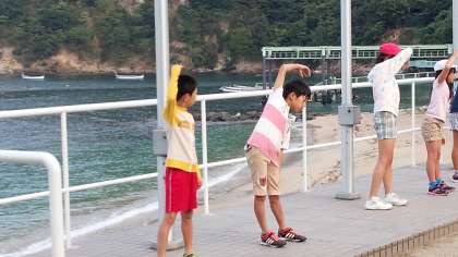 最終日の朝の集いです。旗係、体操係、それぞれしっかりやっています。
