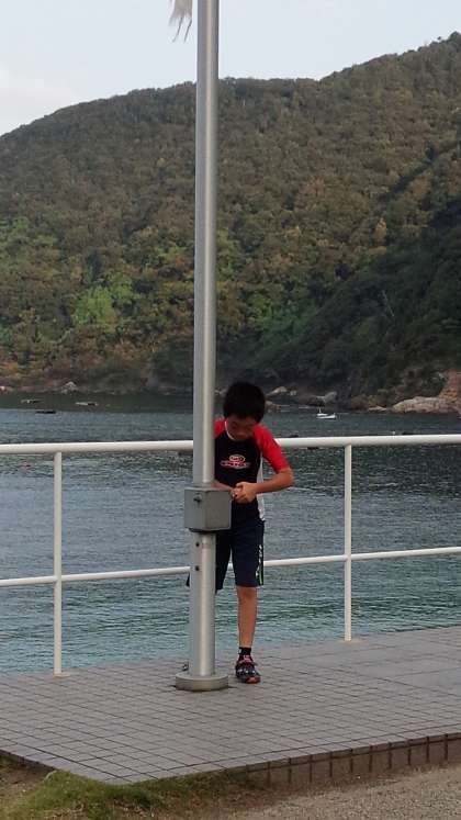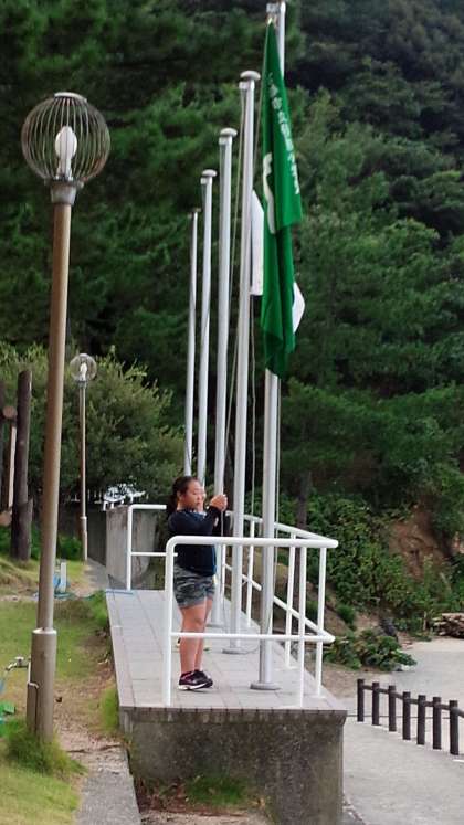 最終日の朝の集いです。旗係、体操係、それぞれしっかりやっています。