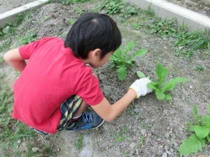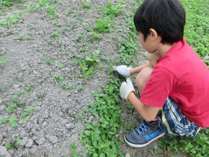 全校で育てている大根と学級で育てている大根があり,2か所の畑で雑草をい抜きました。調べ学習で,栄養が取られないように雑草は抜く必要があることを学んでおり,より大きな大根になるようにとがんばっていました。