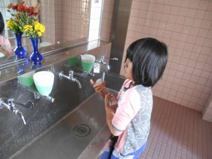 雑巾の絞り方を教えたら、次の日も同じ場面で出会ってしまいました。しっかり学習したことを活かして、雑巾を絞っていました。小さなことでも毎日少しずつ、教えていくと確実に身に付けていきます。
