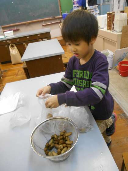 塩ゆでした落花生をできているか確かめて、お世話になっている方に配りました。残念ながら、たくさんできていないので、今日学校へ来られている方だけで、それもほんの少しですがお渡ししました。
