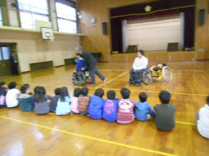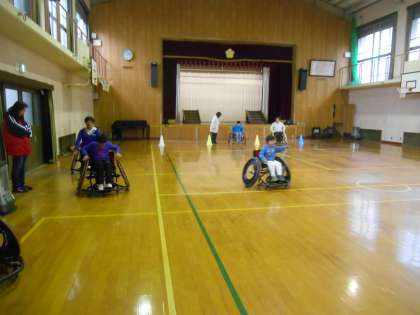 車椅子バスケットボールチーム「アップス」の選手の方に来ていただき、車椅子バスケットボールの技能や車椅子で自由自在に素早く動く様子を見せていただきました。実際に、自分たちも基本操作をしましたが、なかなかうまくいかないようでした。バスケットボールもしましたが、惜しい場面もあるものの、シュートは決まらず、下半身が動かない、力が入らない状況で、あれだけのことができるようになるために練習をがんばってこられたことが分かりました。