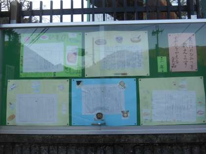 校門の掲示板に、国語学習で作成した「姿を変える食品」についての説明文を掲示しました。まず、つぎに、さらに、〜このように、といった{接続詞を使うことや、接続詞を使うところで、次の例になるので、段落となることを理解して、書きました。段落構成を考え、段落ごとの内容を本で調べ作文にしていきました。例に挙げた食品の挿し絵をかいたり、本のコピーをはりつけたりして、説明を分かりやすくしました。