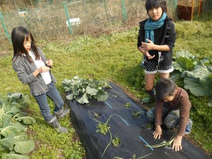 社会科学習で、農家の仕事を学習しています。3年生は、いまさら、調べに行くこともないですが、どんなものが今植えられているか確認しに行きました。冬野菜と夏野菜については、確認できました。農事暦を今までしてきたことをもとに作ってみました。耕すことや、肥料を混ぜること、間引きや芽かき、雑草取りなど順番が分かっていて、種まき苗うえから収穫まで、一応かけています。