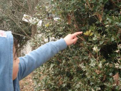 昼休みに校庭の自然に目を向けたり、ちょっといたずらしたりしてみました。ミカンの木のミカンの上にミカンを積んでみると黄色い雪だるまに見えそうです。葉っぱの色が少し変わってるところを見つけた子もいました。こんなに寒いのに、新しい葉っぱができているんだね。春の準備をしているのかな・
