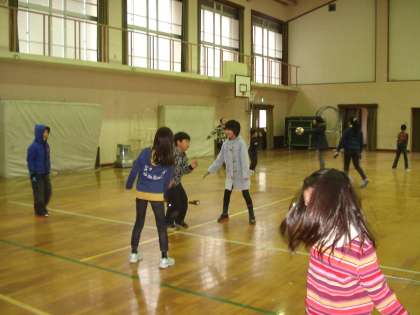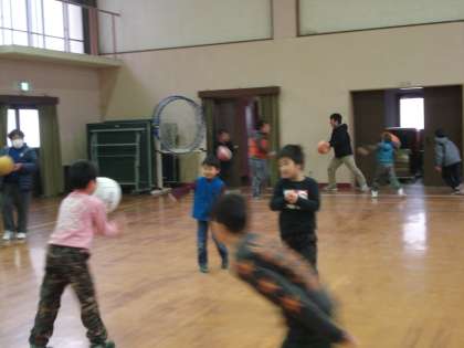 雨や雪で運動場が使えない時は、体育館で遊んでいます。思い思いにドッジボールや縄跳び、バスケットなどして楽しみます。今は、教師塾の若い先生が来てくれているので、子どもたちは大喜びです。