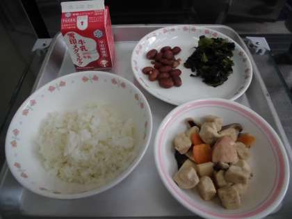 麦ごはん 牛乳 高野どうふと野菜の炊きあわせ ほうれん草のおかか煮 金時豆の甘煮