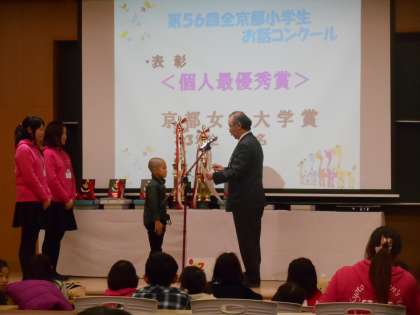 お話コンクールで素晴らしい発表をしてくれたあと、午後から表彰式がありました。発表の前には祈るようなポーズで緊張を表していました。そして、その結果、個人最優秀賞に選ばれました。また学校には指導者賞をいただきました。たくさんの応援もいただきありがとうございました。